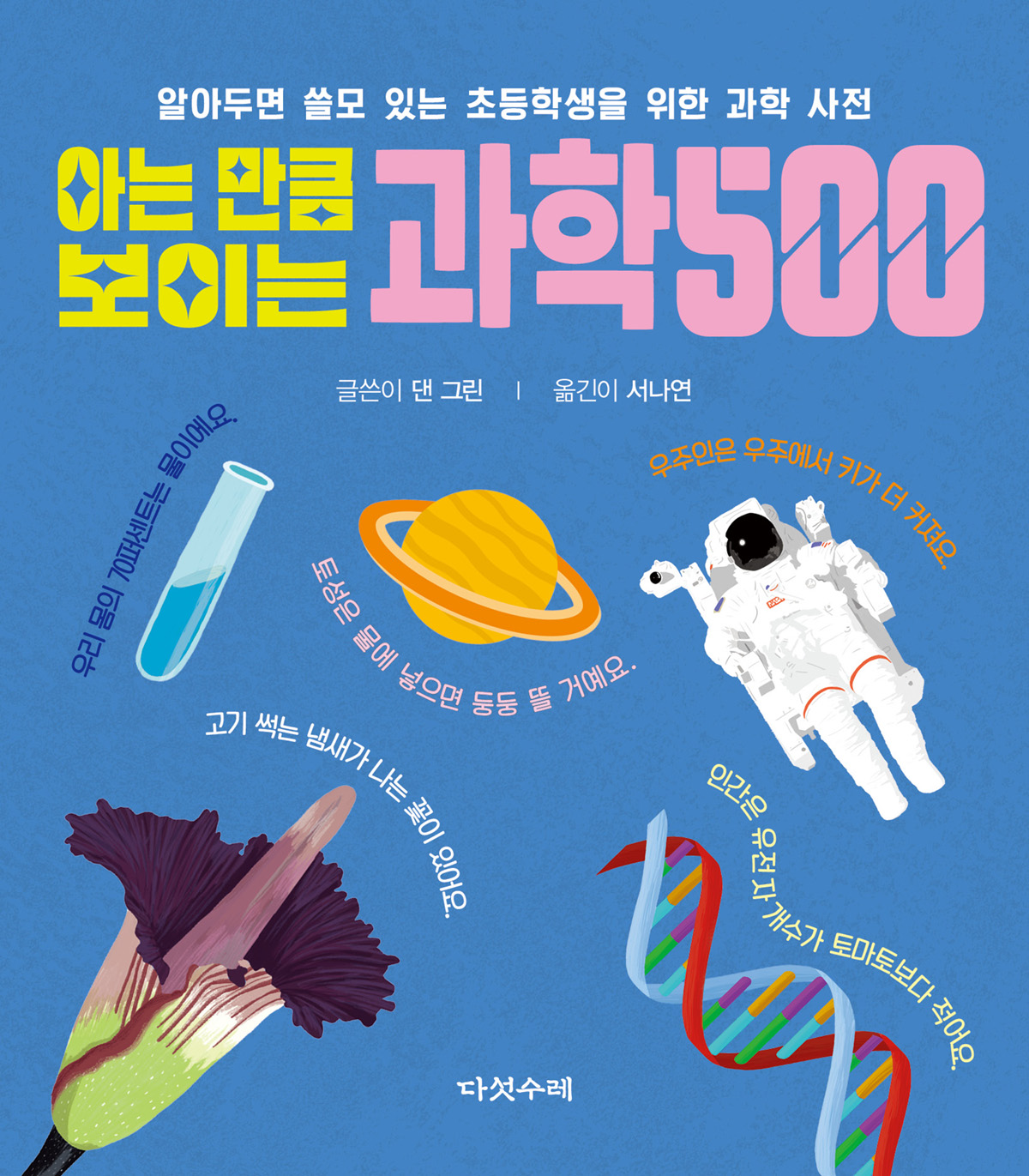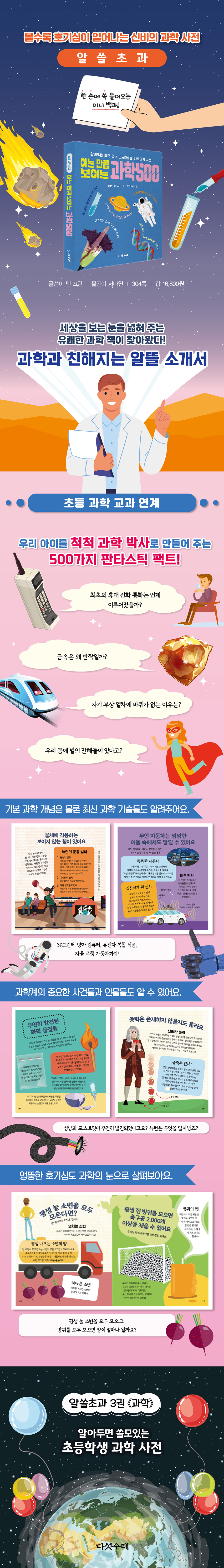 <알아두면 쓸모 있는 초등학생을 위한 과학 사전>은 과학에 대한 500가지 사실을 유쾌한 삽화와 함께 알려주는 어린이 지식 교양 시리즈이다. 한 손에 쏙 들어오는 크기로 언제 어디서나 쉽게 볼 수 있는 작고 가벼운 책인 것이 특징이다. 3권 《아는 만큼 보이는 과학 500》은 선사 시대에서부터 오늘날까지, 지구 내부에서부터 우주까지, 기본 과학 개념에서부터 최신 과학 기술까지 과학에 대한 특급 지식들을 제공한다. 아이들의 엉뚱한 호기심보다 더 기상천외한 발명들과 우주 생태를 살펴볼 수 있다.