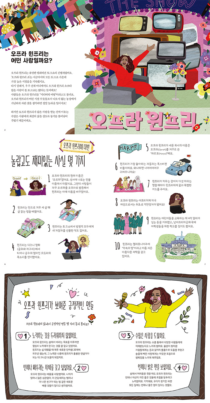 <놀랍고 멋진 사람들> 2권. 오프라 윈프리는 유독 ‘최초’라는 수식어로 많이 기억되는 인물이다. 뜨거운 열정과 포기를 모르는 성실함 덕분이다. 이 책에서 오프라 윈프리의 실패를 두려워하지 않는 긍정적인 태도, 타인을 진심으로 대하고 돕고 싶어 하는 따뜻한 마음, 배움을 사랑하고 끊임없이 새로운 것에 도전하는 적극성 등을 배울 수 있다.