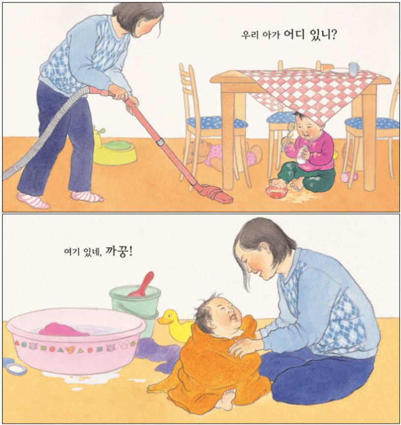 아기와 엄마가 까꿍놀이를 하는 장면을 통해 시지각을 훈련하는 몸놀이 그림책. 아기가 까꿍 놀이를 하면서 눈앞에 보이지 않다가도 다시 나타나는 모습이 반갑게 그려진다. 아울러 아기 욕조, 물놀이 인형, 장난감으로 어지럽혀진 방 등 아기의 일상생활을 그대로 재현한 그림이 엄마와 아기에게 포근한 느낌을 주고 있다.