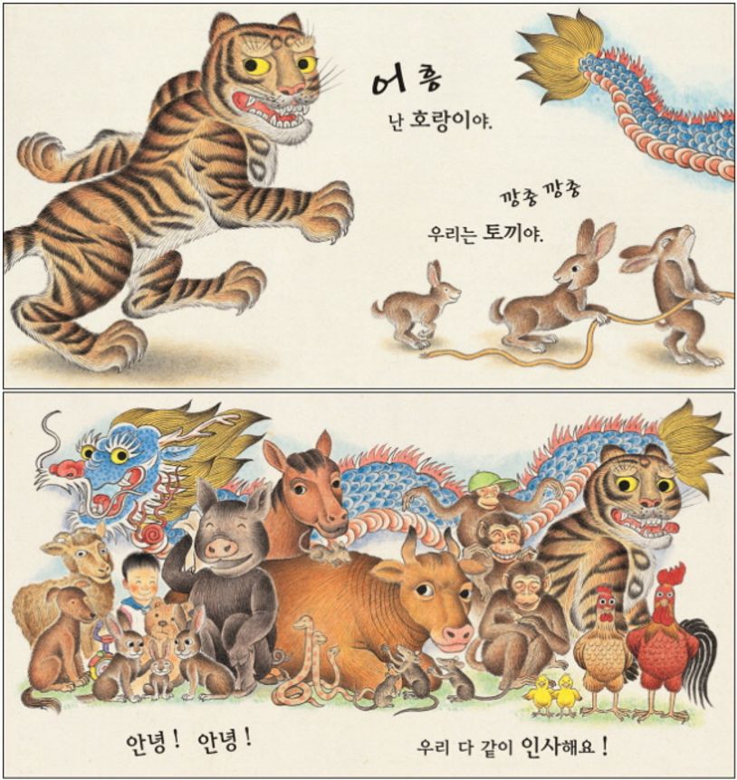 열두 띠 동물을 순서대로 만날 수 있는 배움 놀이책. 의성어와 의태어도 풍부하게 담아내 동물들의 특성을 입체적으로 파악하도록 꾸몄다. 특히 민화 기법의 생동감 넘치는 익살스러운 그림을 통해 유아가 동물들을 뚜렷하게 인지하도록 구성하였다.