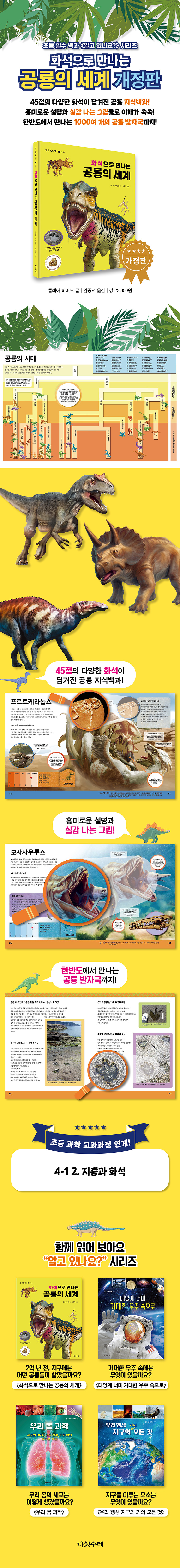 머나먼 과거에 공룡은 어떻게 살았을까? 한때 고대 하늘과 땅과 바다에서 번성했지만 지금은 사라져버린 공룡에 대한 궁금증을 시간의 기억을 품은 화석을 통해 풀 수 있다. <화석으로 만나는 공룡의 세계>는 전 세계에서 발굴된 화석의 비밀을 파헤쳐 다양한 공룡의 분류와 놀랍고 흥미로운 생태를 알려준다. 모든 책장마다 담긴 생생한 시각 자료는 신비로운 공룡에 대한 아이들의 호기심을 충족시키면서 공룡의 시대를 탐험하며 더 큰 상상력을 발휘하게 할 것이다.