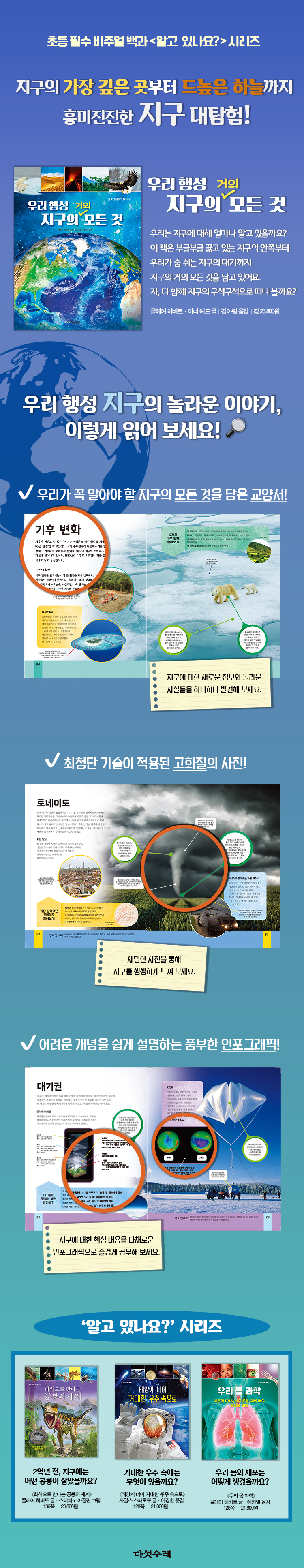 지구에 대한 기본 지식은 물론 기후 변화, 극궤도 기상 위성, 인구의 변화처럼 어린이들이 꼭 알아야 할 ‘지금’ 우리 지구의 이야기를 촘촘하게 담고 있다. 이 책은 지구라는 시스템을 이루는 다양한 요소들을 먼저 알아보고 지구 안쪽의 거대한 에너지로 일어나는 지각 현상들, 그 지각을 이루는 광물과 암석, 물과 대기의 순환으로 발생하는 기상 현상들, 수많은 생물체의 서식지인 땅과 바다, 그들과 함께 살아가는 인간의 모습을 차례차례 담고 있다.