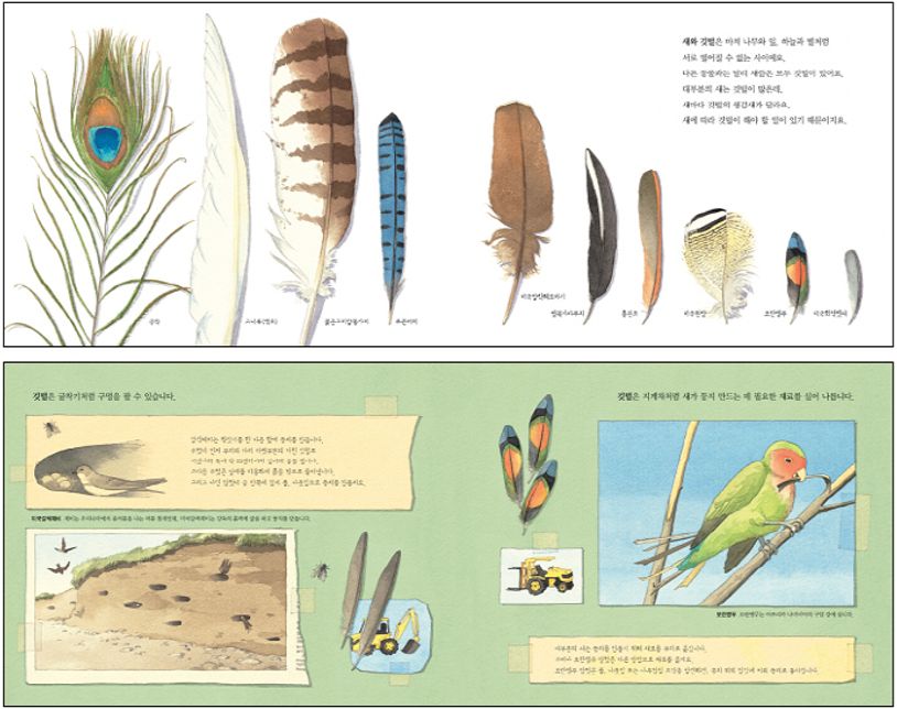 스크랩북처럼 핀, 클립, 테이프 등으로 붙여 놓은 듯 표현한 그림들은 아이들에게 친근감을 준다. 책의 끝부분에는 과학자들이 일반적으로 깃털을 분류하는 방법을 소개하여 깃털의 명칭과 기능을 알기 쉽게 설명하고 있다.