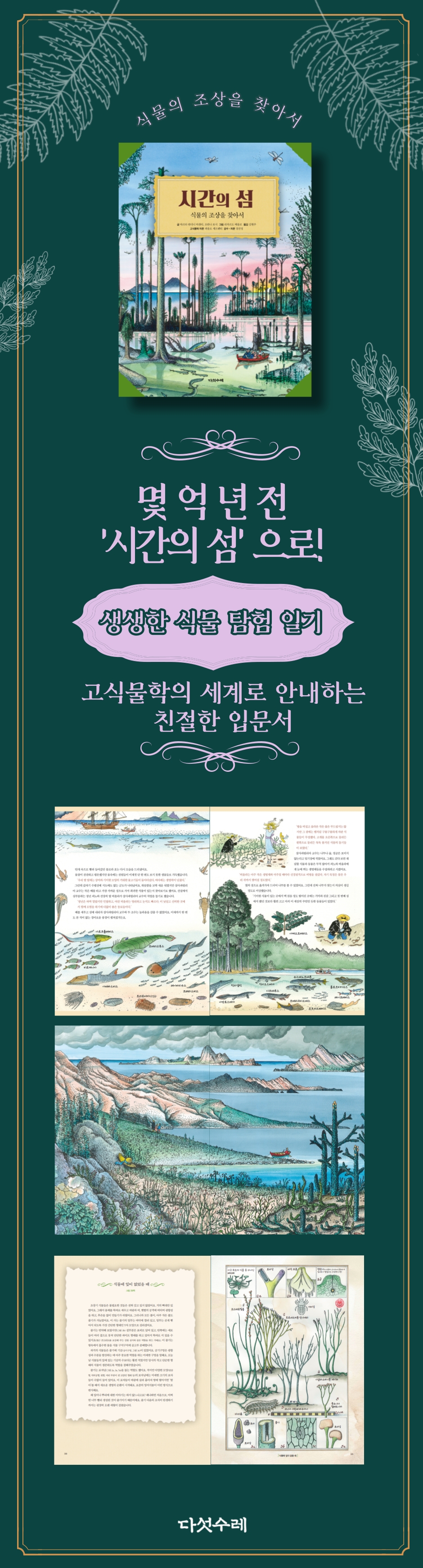 이 책의 주인공인 살사파릴리아 교수는 ‘시간의 섬’이라는 신비한 곳에 도착하게 된다. 수억 년 전 식물들의 비밀을 하나씩 풀어가는 모습이 마치 일기를 쓰듯 생생하게 그려져 있다. 바다에서 육지로 올라오고, 잎과 줄기를 갖추며, 거대한 숲을 이루어 간 식물의 여정을 따라가 보자. 어린이부터 어른까지 누구나 이 책을 통해 지금까지 한 번도 보지 못했던 신기한 식물의 세계를 만나볼 수 있다.