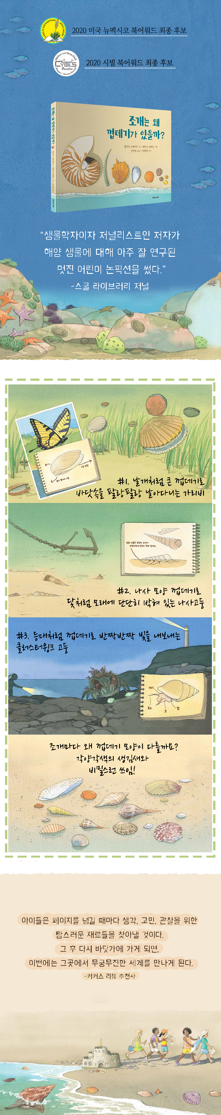 껍데기에 기체를 넣었다 뺐다 할 수 있는 앵무조개는 마치 잠수함처럼 물 위에 떠 있다 물속에 잠겼다 움직일 수가 있어요. 나사고둥은 나사처럼 빙빙 비틀린 모양의 껍데기 덕분에 닻처럼 물속 바닥에 가만히 머물러 있을 수 있고요. 다양한 모양의 조개껍데기는 각각의 조개들이 먹이를 찾아 먹고, 천적을 피해 숨을 수 있도록 도와주지요.