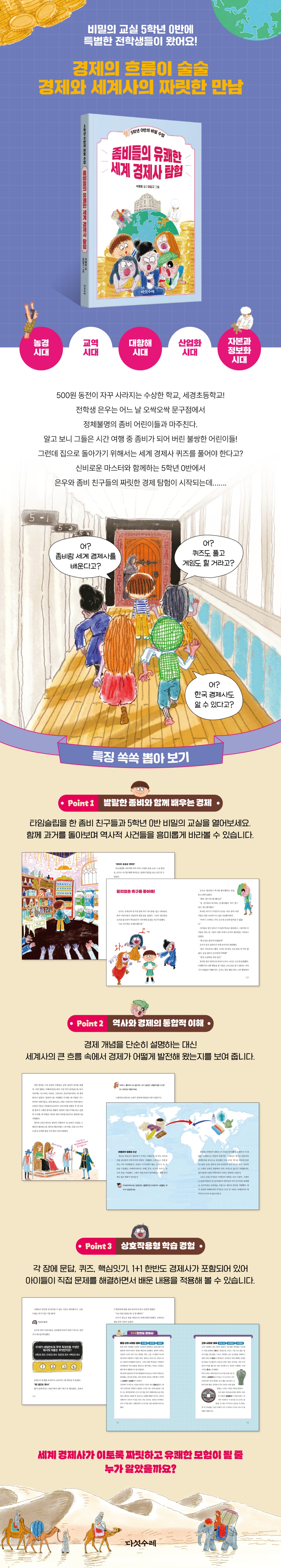 세계 경제사, 좀비들과 함께라면 유쾌하게 배울 수 있다고!? 선사 시대부터 현대까지, 엉뚱발랄한 좀비 친구들과 함께 세계 경제의 흐름을 배우는 어린이 교양서. 신비로운 비밀의 교실에서 펼쳐지는 특별 수업과 퀴즈를 통해 경제사를 쉽고 재미있게 익힐 수 있다.
